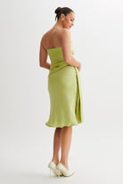 The ALLEGRA Satin Knee Length Skirt epitomises understated elegance and timeless sophistication. With its high-waisted design, it elongates the silhouette for a flattering look. Crafted to knee length, it strikes the perfect balance between classic and modern style. The bias cut adds fluidity and movement, enhancing the skirt's graceful silhouette. Designed with a straight silhouette, it exudes versatility and sophistication. Complete with a side zip for ease of wear, the Allegra Skirt is a wardrobe staple that effortlessly transitions from day to night with refined charm. Pair with the Allegra Satin Ruched Strapless Top for a complete look.
