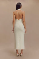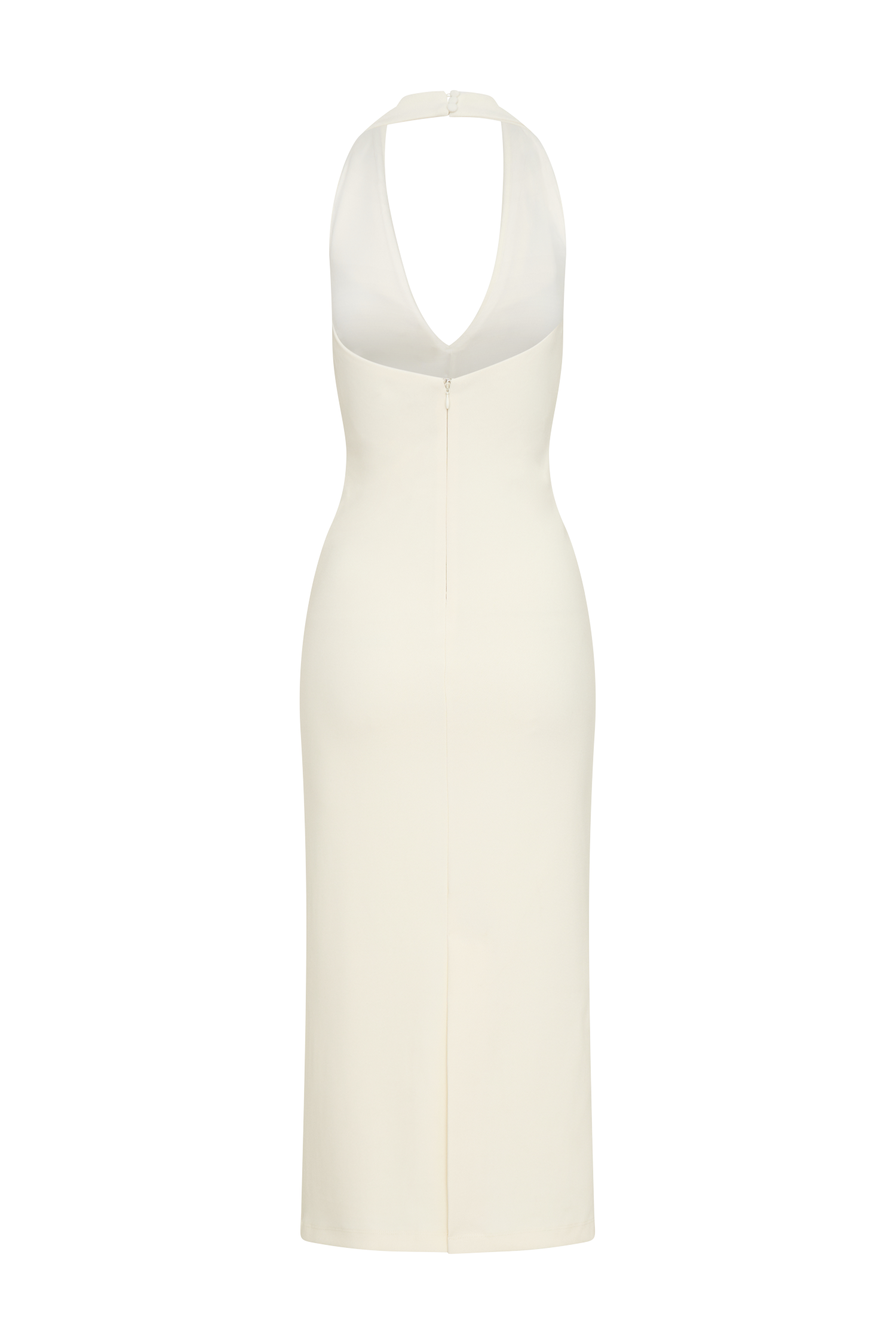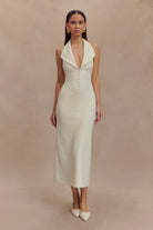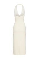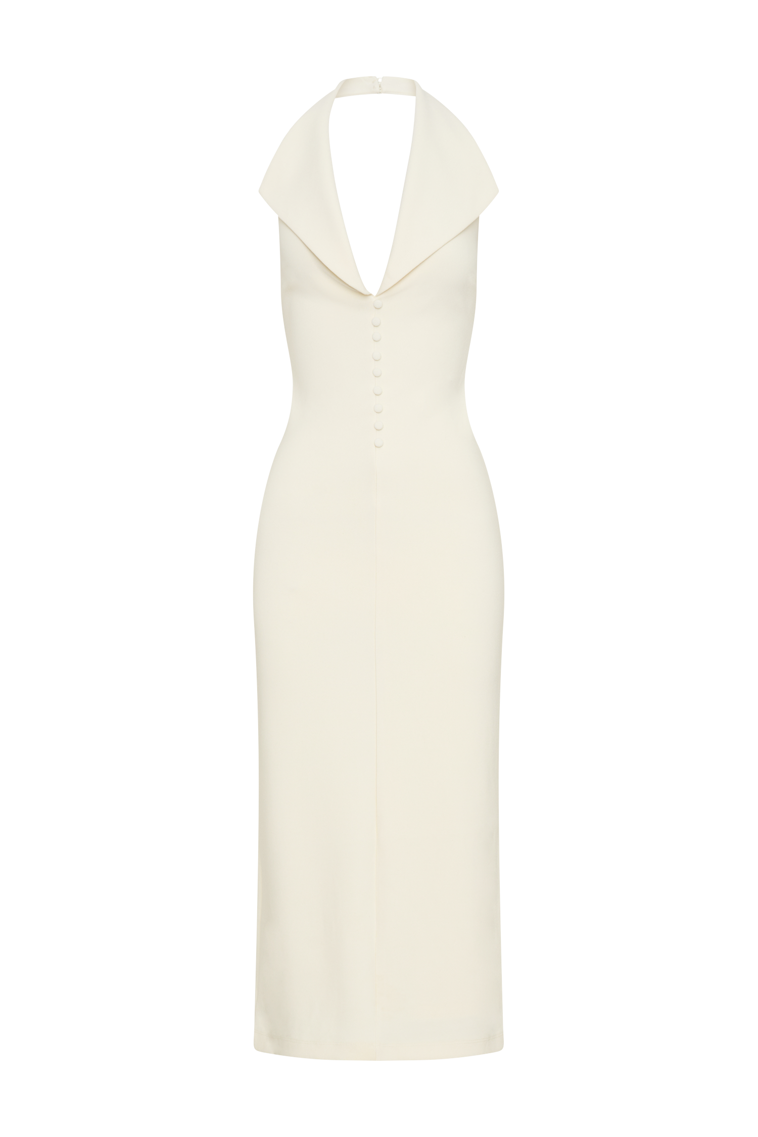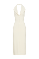 The ANNITA Crepe Halter Midi Dress exudes timeless elegance with its deep V neckline and halter design. Featuring a collared neckline and a button front (non-functional), this dress combines classic elements with a modern edge. The open back adds a touch of allure, while the fitted silhouette accentuates the figure gracefully. Crafted from luxurious crepe, the midi length offers a sophisticated and versatile option for any occasion, ensuring you make a stylish statement wherever you go.