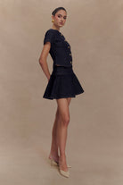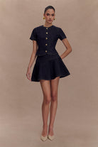 The ARISTA Denim Mini Skirt is a fresh take on classic denim, combining structure with a feminine silhouette. Designed with a high-waisted fit and a structured waistband, this mini skirt cinches at the waist before flaring into a soft, fluted lower skirt for effortless movement. A discreet side zip ensures a sleek fit, while the mini length adds a playful touch. Pair it with the Bethany Short Sleeve Buttoned Denim Top for a chic, coordinated look that blends casual charm with elevated style.