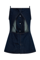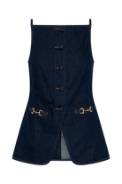 The ASHTON Sleeveless Button Denim Top is a fresh twist on a classic. With a straight neckline and shoulder straps, this top combines structure and style with an open back that adds a touch of daring. The front features a non-functional button closure for a chic, streamlined look, while custom buckle hardware on the pockets brings a unique edge. Designed in a flattering longline silhouette, it finishes with a slight flare at the hem for a playful yet polished feel. This top is a versatile statement piece, perfect for pairing with high-waisted bottoms or layered under a jacket.