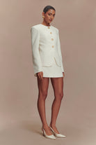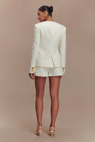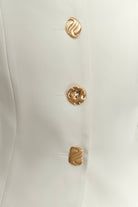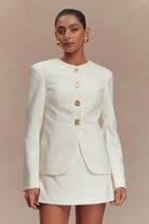 Make a statement with the ASIA Mixed Button Blazer, a refined blend of modern sophistication and timeless tailoring. Featuring a unique round neckline and structured shoulder pads, this blazer creates a commanding silhouette. The button-front closure is adorned with custom decorative buttons, adding a touch of individuality to this longline design. Fully lined for a luxurious feel, it’s perfect for layering in style. Pair it with the Alix Suiting Mini Skort for a polished and coordinated ensemble that seamlessly transitions from the office to after-hours.