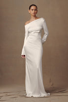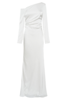 The AVERY Long Sleeve Maxi Dress features an asymmetrical drop shoulder neckline, adding modern sophistication. With long sleeves for coverage and grace, it boasts side gathered waist detailing for a touch of femininity. Lined for comfort, this dress ensures you look and feel your best for any elegant occasion.