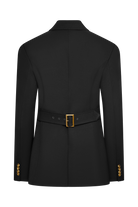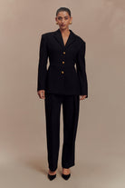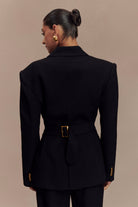 The BELLAMY Cinched Blazer is a statement piece that combines timeless elegance with a contemporary edge. Featuring a button front closure, classic collar and lapel, and strong structured shoulders enhanced with shoulder pads, this blazer offers a powerful silhouette. The long sleeves and functional welt pockets add both style and practicality, while the centre back vent ensures ease of movement. Fully lined for a luxurious finish and with a back belt to cinch the waist, it creates a flattering hourglass figure. Pair with the Penelope Pleated High Waisted Pants for a sophisticated, tailored look.