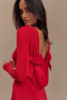 The BENNETT Slinky Long Sleeve Maxi Dress combines sultry elegance with modern sophistication. Featuring a striking low back cowl neckline with playful back bows, this bodycon dress perfectly hugs your curves, creating a figure-flattering silhouette. Crafted from stretch fabrication for a comfortable yet sculpting fit, the long sleeves add a touch of balance, while the maxi length adds a dramatic flair. Ideal for evening occasions, this dress effortlessly blends bold style with refined allure, making a memorable statement wherever you go.