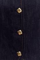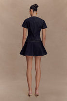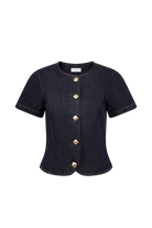 The BETHANY Short Sleeve Buttoned Denim Top is a fresh take on structured femininity. Featuring a sleek round neckline and short sleeves, this fitted design flatters the figure while front and back paneling add a touch of modern tailoring. The flared hem shape creates a soft, feminine finish, while custom mismatched buttons bring a unique and playful detail. Pair it with the Arista Denim Mini Skirt for a coordinated look that blends effortless charm with contemporary edge.