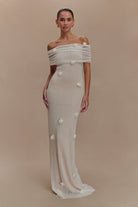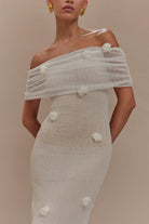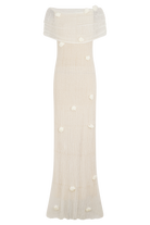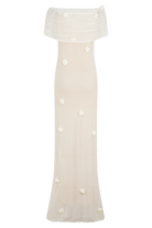 Make an unforgettable statement in the BRYNN Orchid Knit Maxi Dress, a perfect blend of elegance and modern femininity. Designed with an off-the-shoulder neckline, this dress drapes beautifully, highlighting your décolletage. The ruched overlay creates a flattering silhouette, while delicate flower appliqués add a whimsical, romantic touch. Crafted from a sheer knit and mesh-lined for coverage, the maxi-length design flows effortlessly with every step. Whether for a special event or a night to remember, this dress is your go-to for timeless sophistication.