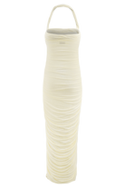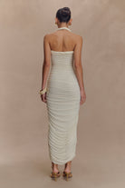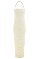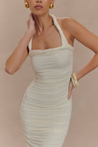 The CAMILA Ruched Halter Midi Dress is designed to contour and captivate. Crafted in soft stretch jersey, this maxi-length silhouette features a ruched body that flatters from every angle. The halter neckline is elevated with a twisted strap and neckline detail, adding a sculptural touch to the sleek design. Fully lined for a smooth finish and easy to pull on, this dress is your go-to for effortless elegance with modern edge.
