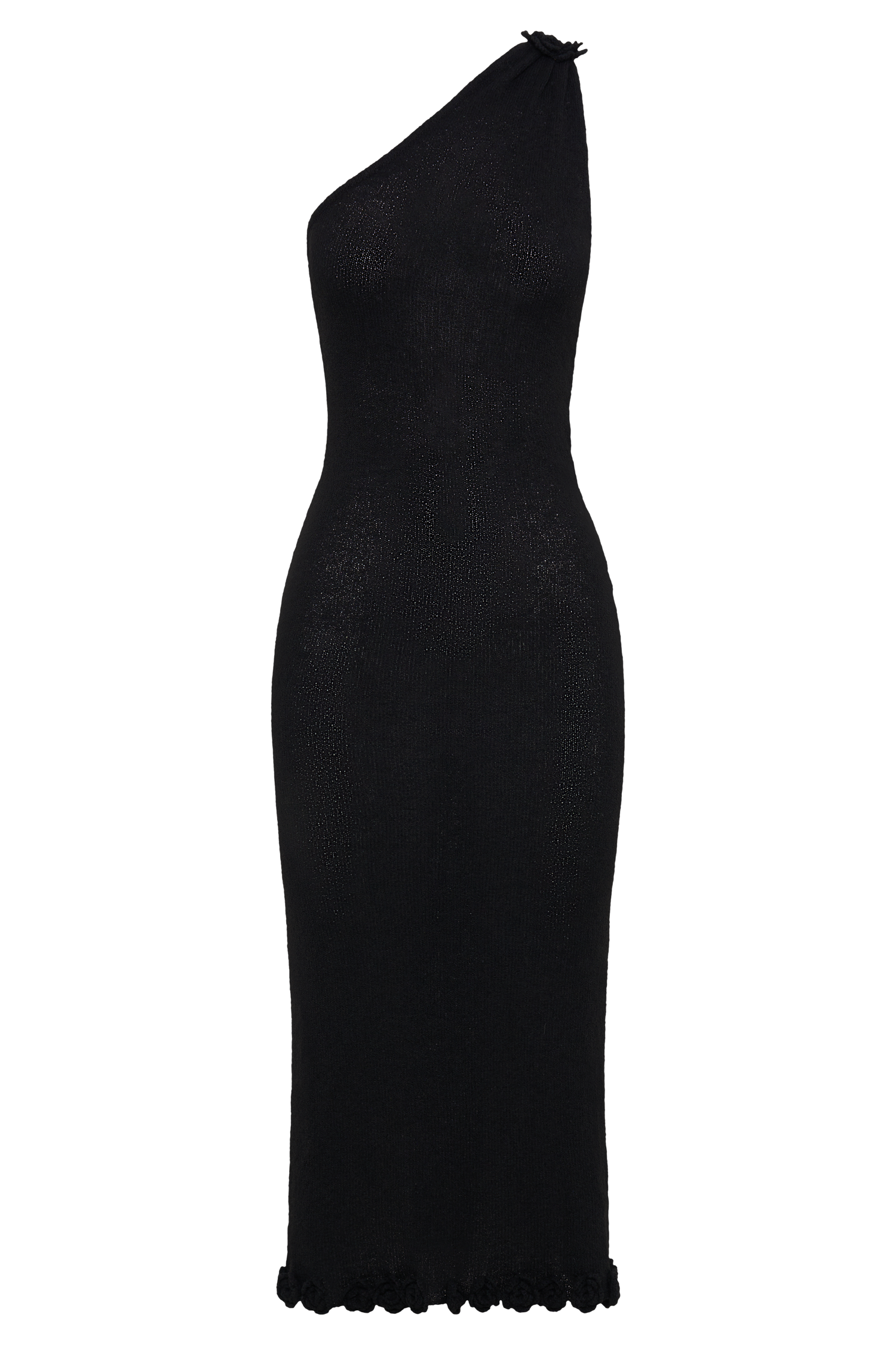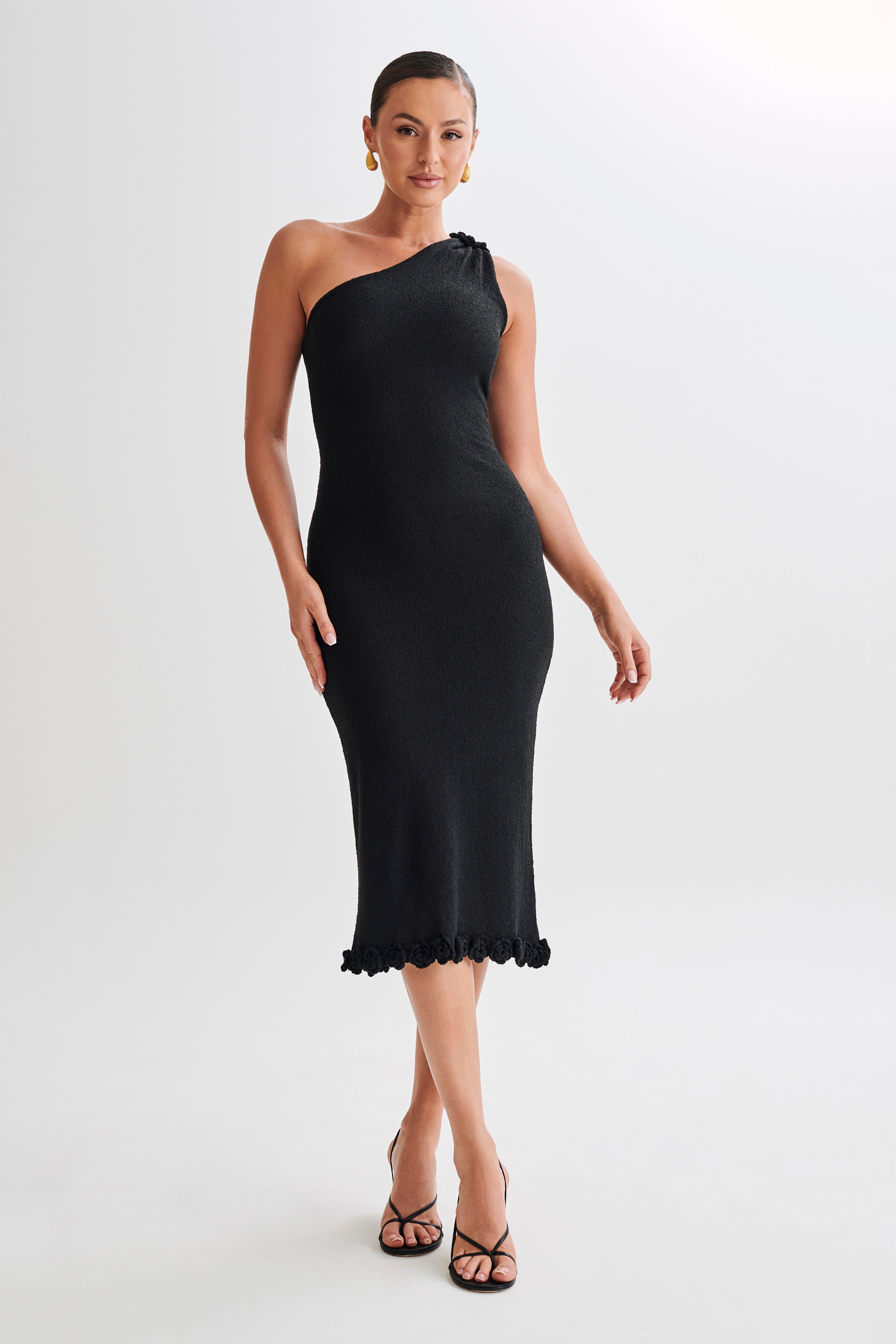 Indulge in effortless sophistication with the CLEMENTINE One Shoulder Knit Midi Dress, a blend of modern elegance and chic design. Featuring an asymmetrical, single-shoulder silhouette, this dress exudes contemporary charm. Unlined and knitted, it offers both comfort and breathability, ensuring you feel as good as you look. With a bodycon fit, it flatters your curves while allowing for ease of movement. The delicate flower applique on the shoulder adds a touch of feminine allure, making this dress perfect for any occasion.