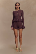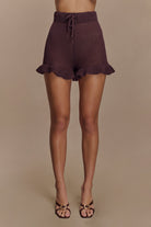 The ELEANOR Knit Frill Shorts are your new go-to for relaxed femininity. Designed with a high waisted fit, elastic waistband, and functional front tie, these shorts offer comfort without compromising on style. The playful ruffle hem adds a soft, romantic finish—perfect for lounging or low-key days out. Pair with the Eleanor Knit Frill Cardigan for a sweet matching set that feels as good as it looks.