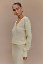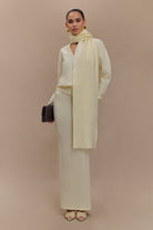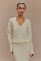 Cosy up in an effortless style with the ELLA V Neck Knit Jumper and Scarf set. Crafted from soft knit fabrication, this jumper features a relaxed, slouchy silhouette with a flattering V neckline and long sleeves, perfect for layering on cooler days. The unlined design keeps it lightweight yet warm, making it an ideal go-to for any season. Complete with a matching scarf for added warmth and style, this jumper effortlessly combines comfort with chic appeal, perfect for everyday wear or dressing up for a cosy, put-together look. Pair with the Elise Knit Maxi Skirt for an elegant, coordinated ensemble.