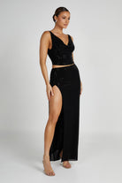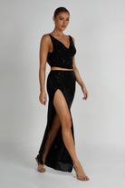 Completely embellished with eye-catching sequins, the ELLERY maxi skirt may be the next best thing to happen to your wardrobe. With a front-side split, it offers a hint of enticement while the mid-rise waistband ensures a comfortable and flattering fit, and the maxi length provides an elongated and graceful silhouette. Pair it with the Ellery Square Diamante Cowl Top and our Zadie Double Teardrop Earrings to complete the look.