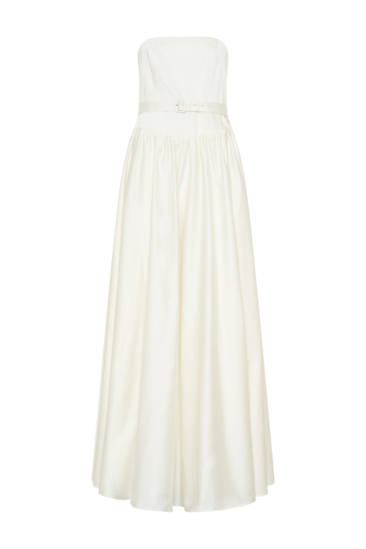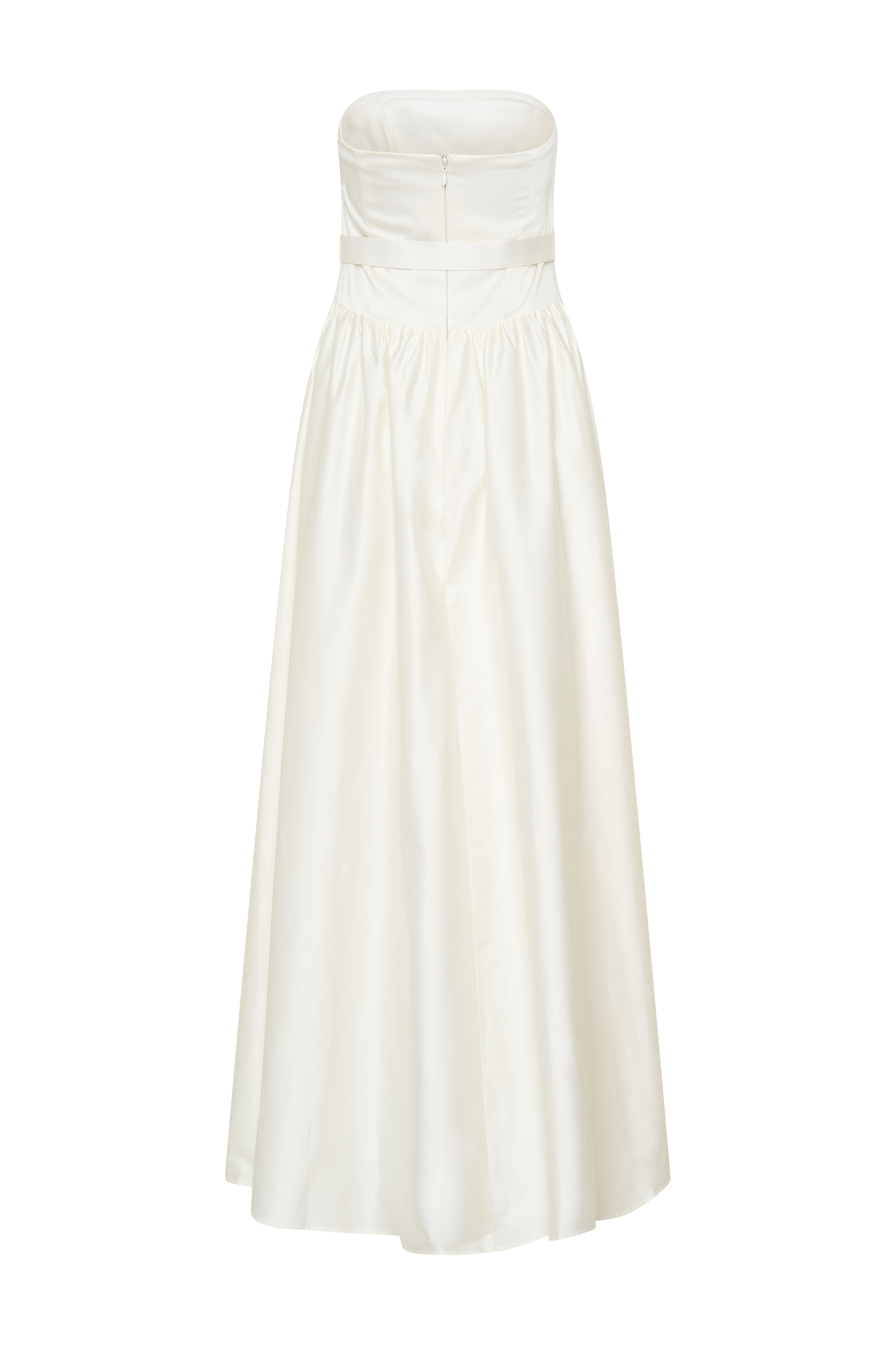 The FLORENCE Strapless Belted Maxi Dress is the epitome of effortless elegance. Designed with a sleek strapless neckline and a flattering drop waist, this silhouette elongates the frame while exuding timeless sophistication. The gathered waist and full skirt create graceful movement, while the matching waist belt cinches for a perfectly defined shape. Fully lined for comfort and finished with a center-back zip and hook-and-eye closure, this dress is a dreamy choice for special occasions, romantic evenings, or modern bridal moments.