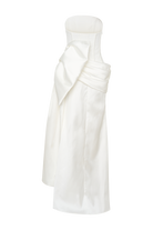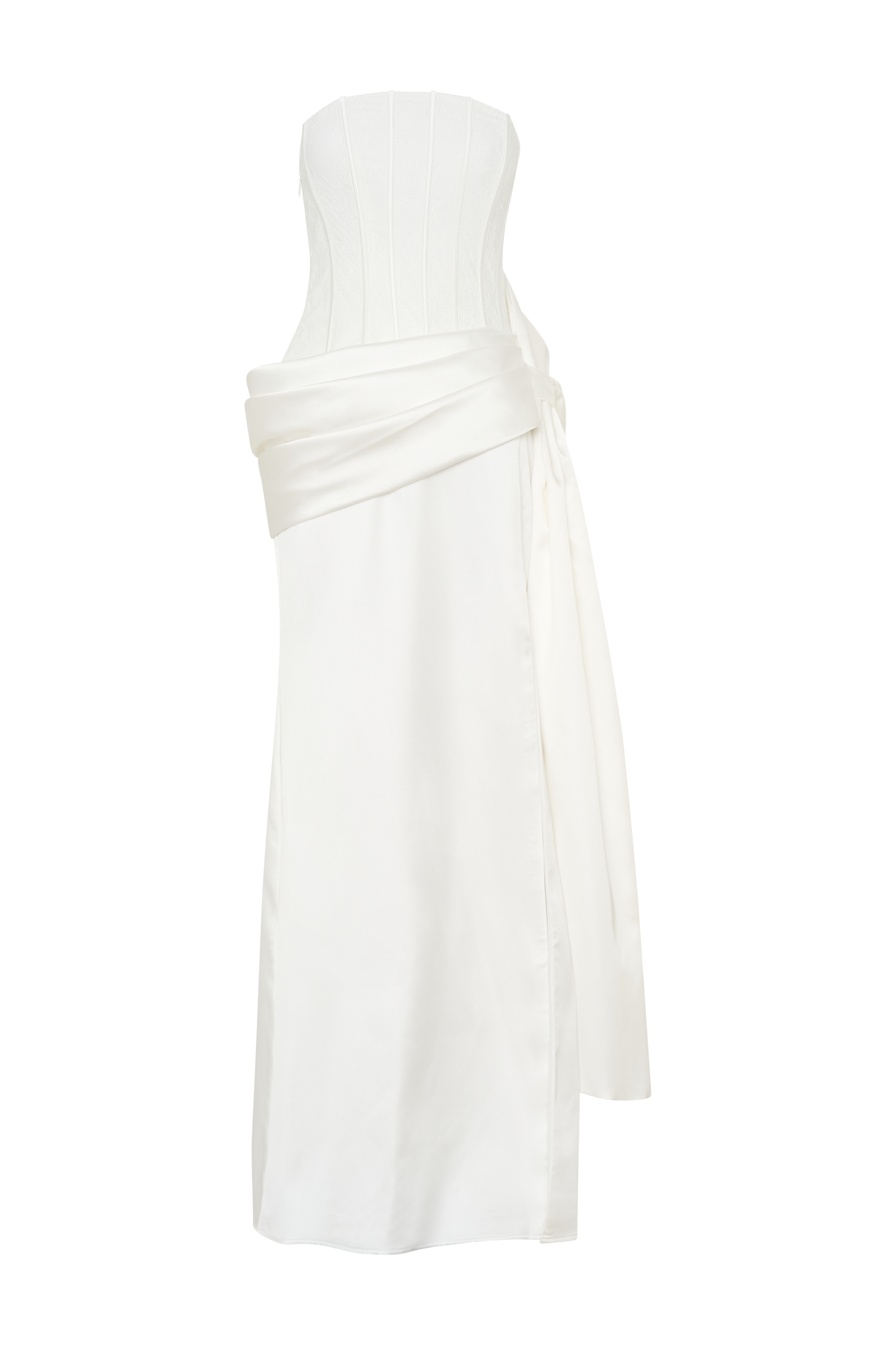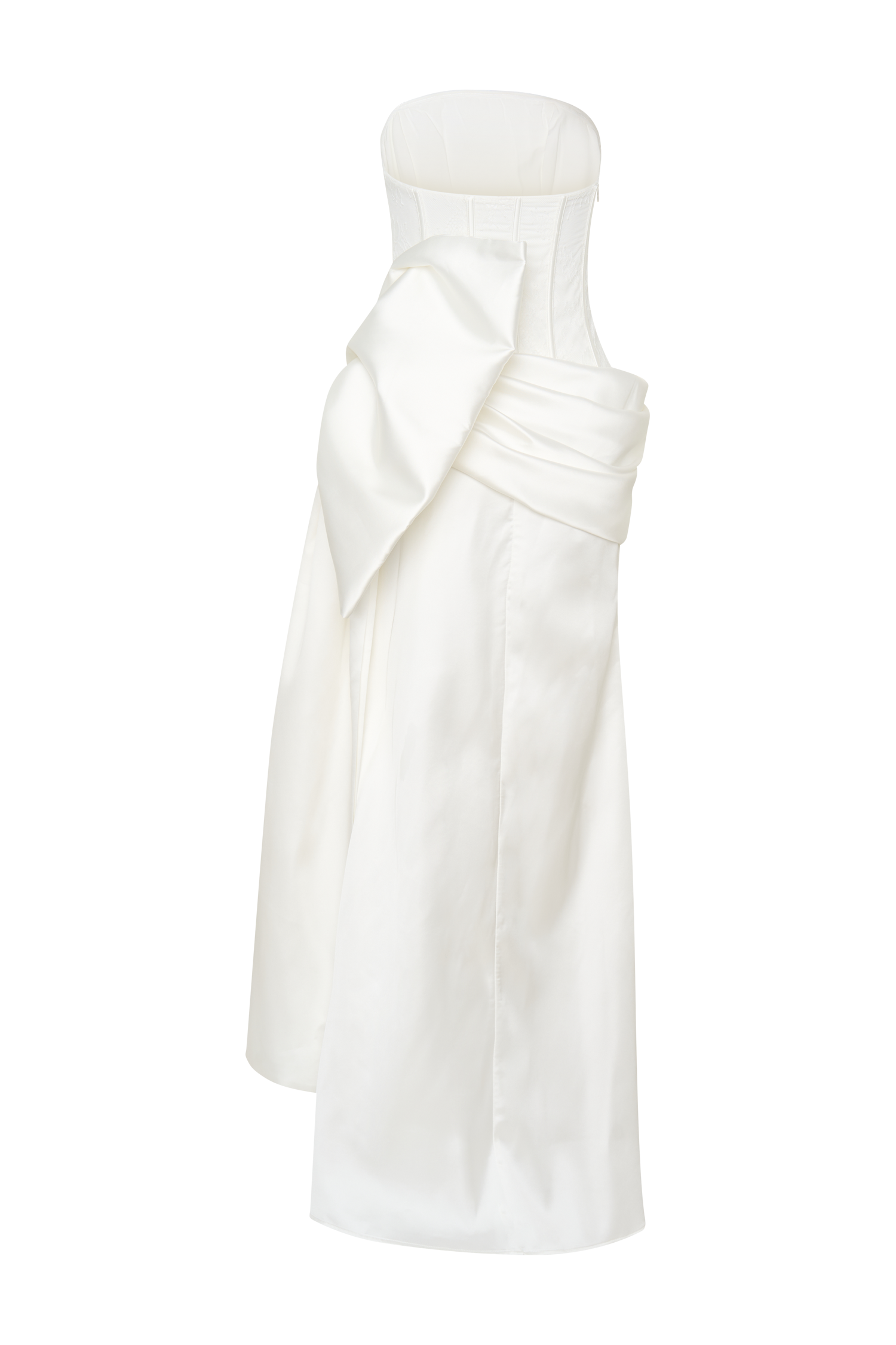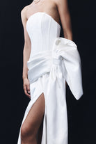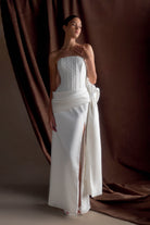 The GALIA Satin Corset Gown is the ultimate statement of sophistication and drama. Designed with a structured, boned lace bodice, this strapless silhouette sculpts and flatters with effortless grace. The sleek satin skirt flows beautifully to a maxi length, while a satin hip overlay and an oversized bow detail add bold, couture-inspired elegance. Fully lined for comfort and secured with an internal elastic waist stay, side zip, and hook-and-eye closure, this gown is perfect for black-tie occasions, wedding celebrations, or any moment that calls for unforgettable glamour.
