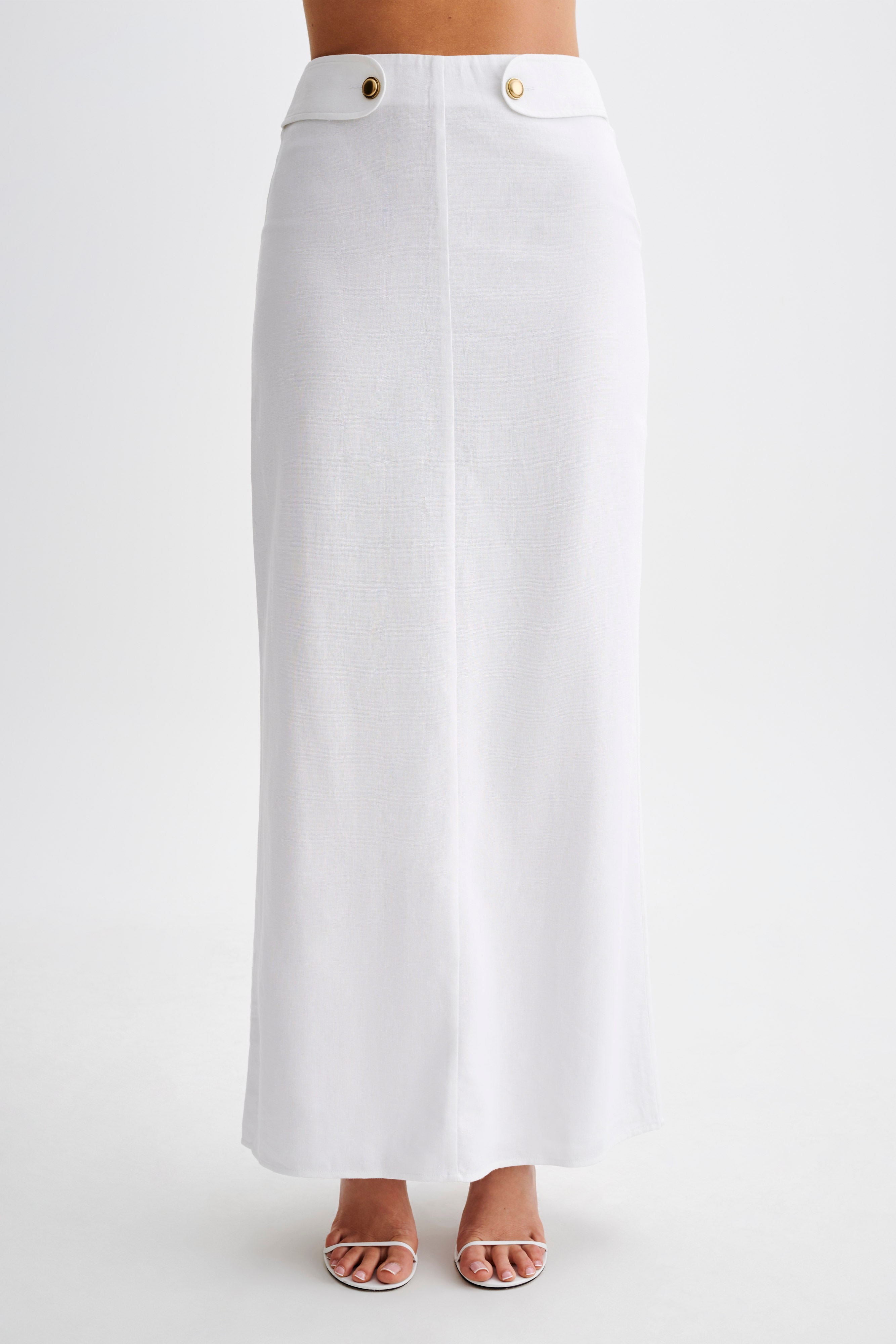 The JORDAN is a maxi skirt crafted with a high-waisted design that elongates the silhouette and accentuates your waistline, creating a flattering and feminine silhouette. Lined for comfort and opacity to ensure a smooth and flattering fit, while the A-line silhouette adds a touch of volume and movement. Adorned with gold buttons down the front, it's completed with a centre back vent for ease of movement and a centre back zipper for convenience. Pair with the Gianni Knit Crop Top to complete the look.