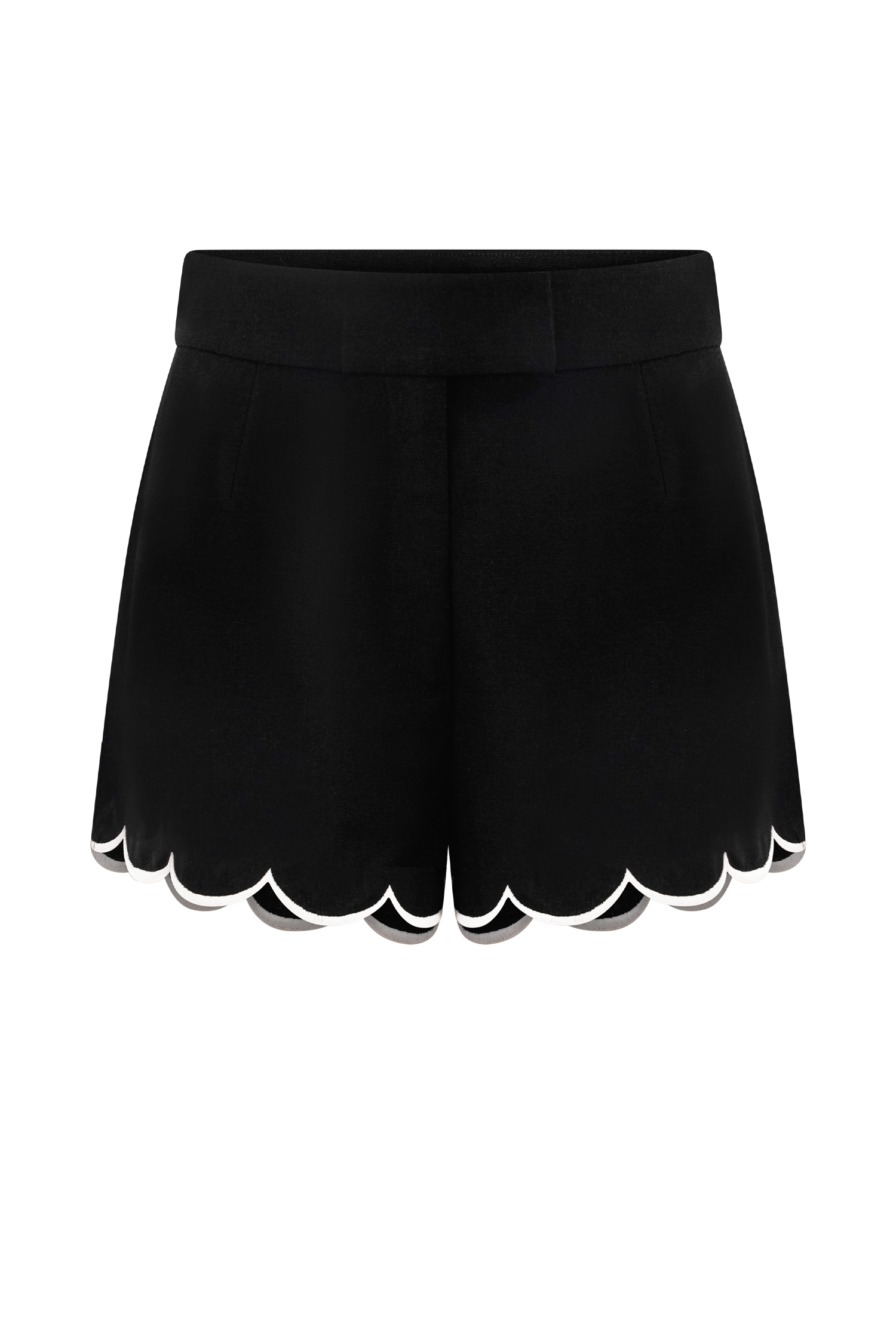 The JUDITH Scallop Shorts bring a feminine twist to classic tailoring. Designed with a flattering high-waisted fit and mini length, these shorts feature a scalloped hem highlighted by contrast white embroidery stitching for a refined finish. A fly front with bar tab fastening ensures a clean, structured look. Pair with the Judith Strapless Scallop Top for a matching set that blends charm, confidence, and effortless summer styling.