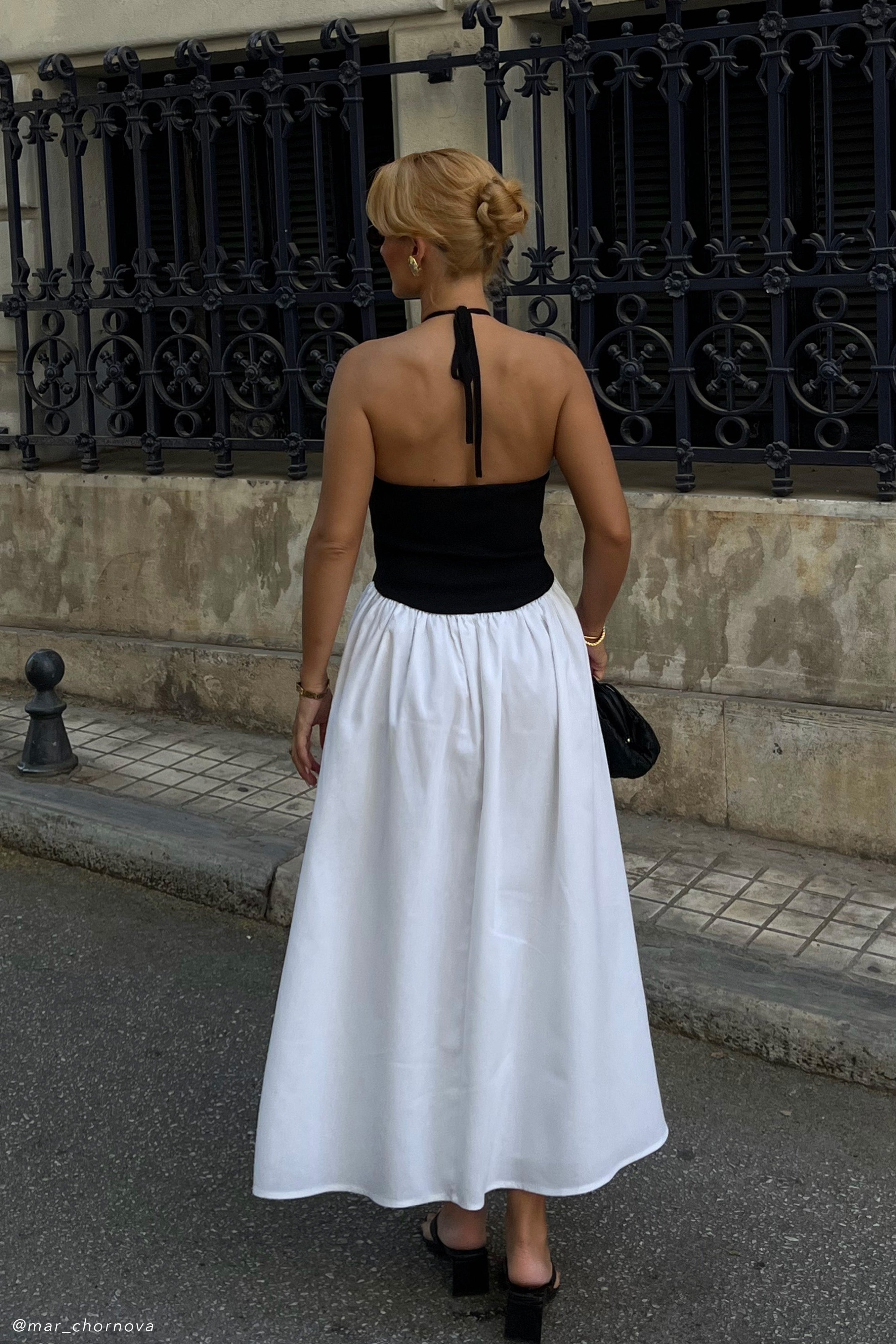 The KATIE is a duo-hue dress, styled into a midi length and crafted from a knit and linen fabrication. We designed it to showcase your shoulders with a halter neckline and crafted it to be fully lined along the skirt for comfortable non-see through day wear.
