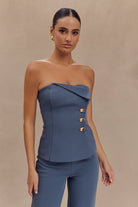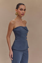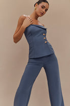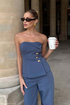 Introducing the LINDIE Strapless Suiting Top, a sophisticated addition to your wardrobe that seamlessly combines elegance and modernity. This strapless design features a chic neck flap detail and a button front closure for a polished finish. The longline silhouette creates a flattering shape, making it perfect for pairing with the Lindie Straight Leg Suiting Pants to form a chic ensemble that exudes confidence and refinement. Fully lined for comfort and quality, this top is versatile enough for both day and night, ensuring you stand out in any setting.