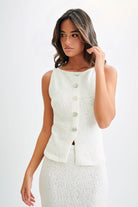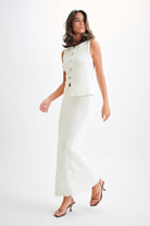 The Mackie Boucle Longline Vest is a sophisticated addition to any wardrobe, featuring a stylish boat neckline and sleeveless design that is perfect for layering. Crafted from boucle knit, this vest provides a unique texture that enhances its luxurious feel. The functional centre front button closure adds practicality while maintaining a sleek silhouette. Designed in a longline cut, this vest offers an elegant, elongated look that pairs effortlessly with both casual and formal outfits. Pair with the Moira Boucle Maxi Skirt to complete the look.