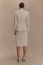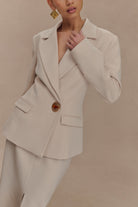 The MAX Cinched Waist Blazer is a refined take on classic tailoring, designed to sculpt and empower. Featuring a notched lapel, V-neckline, and structured shoulder pads, this blazer flatters with a cinched, fitted waist and functional button front closure. Faux front flap pockets add a clean finish, while full lining ensures all-day comfort and polish. Pair with the Vera Twill Split Front Midi Skirt for a power pairing that blends timeless structure with modern sophistication.