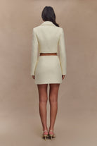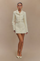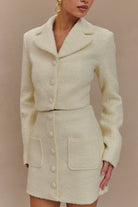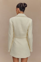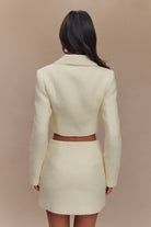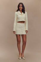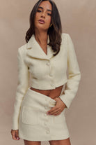 The MIRELLE Textured Boucle Cropped Long Sleeve Top brings classic elegance with a modern twist. Featuring a sophisticated collared neckline and button-front closure, this cropped top offers a polished silhouette enhanced by structured shoulders. Crafted from luxurious boucle fabrication and fully lined for comfort, it’s the perfect blend of texture and tailoring. Pair it with the Mirelle Textured Boucle Mini Skirt for a coordinated look that’s effortlessly stylish and refined.