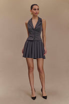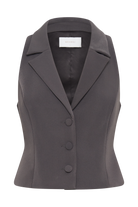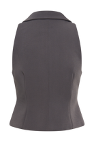 This is a sleeveless, single-breasted suiting vest with a deep V-neckline and functional front buttons. The lapel collar and longline bodice add structure to the soft, comfortable fabrication, seamlessly blending form and function. The silhouette is a suiting classic–clean lines, smooth edges, and subtle details. Minimalist and modern, MURA is a beautiful, versatile addition to your wardrobe for wear season after season. Complete the look with a structured, textured skirt like Mura Pleated Mini Skirt.