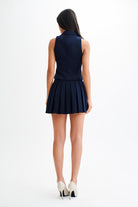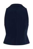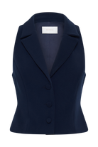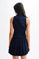 This is a sleeveless, single-breasted suiting vest with a deep V-neckline and functional front buttons. The lapel collar and longline bodice add structure to the soft, comfortable fabrication, seamlessly blending form and function. The silhouette is a suiting classic–clean lines, smooth edges, and subtle details. Minimalist and modern, MURA is a beautiful, versatile addition to your wardrobe for wear season after season. Complete the look with a structured, textured skirt like Mura Pleated Mini Skirt.