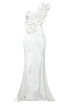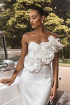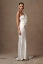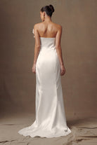 Prepare to turn heads on your special day with the OLIVIA Strapless Satin Rose Wedding Gown, a breathtaking masterpiece designed to make your dreams come true. Boasting a timeless strapless silhouette and a regal princess neckline, this gown exudes pure elegance from every angle. Lined for comfort and featuring a convenient side zip for easy dressing, it ensures a flawless fit that hugs your curves in all the right places. The bodycon design gracefully flares into a hem that adds a touch of drama to your walk down the aisle. To top it off, delicate rose applique along the front adds a romantic and ethereal touch, ensuring you'll be the epitome of bridal beauty on your special day. With the inclusion of an internal bustle, effortlessly manage the train as you glide gracefully throughout your celebration, creating memories to last a lifetime.