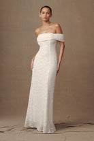 Presenting the PRIYANKA Daisy Beaded Off-Shoulder Wedding Gown, a stunning embodiment of romance and sophistication. With its off-the-shoulder straight neckline, this gown exudes timeless elegance. Adorned with a rushed overlay bust panel, it adds a touch of grace and charm to the ensemble. Boasting a bodycon silhouette and lined for comfort, it ensures a flattering fit that accentuates your curves with grace. Complete with a convenient centre-back zip, the Priyanka gown is the epitome of chic style, perfect for your special day.