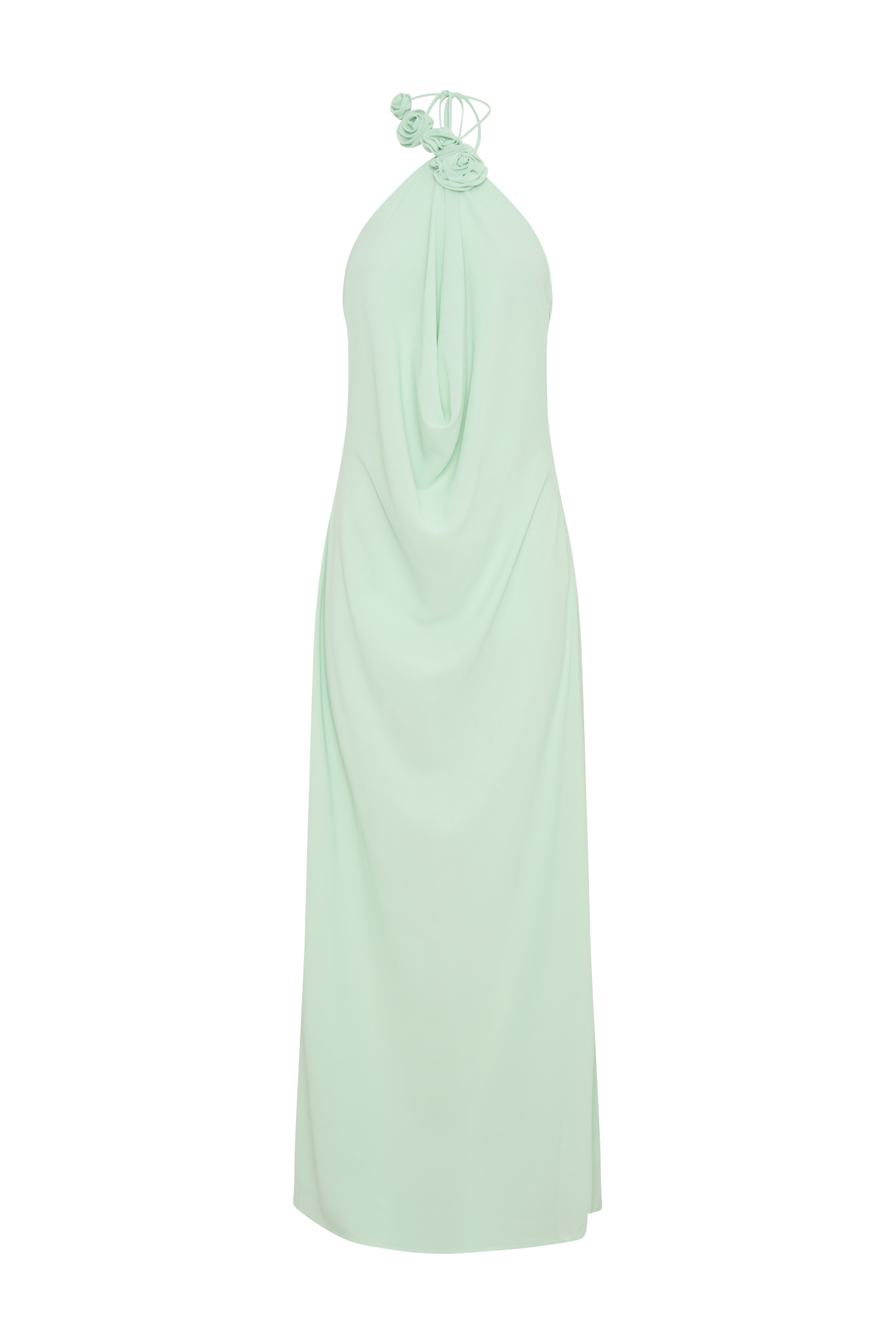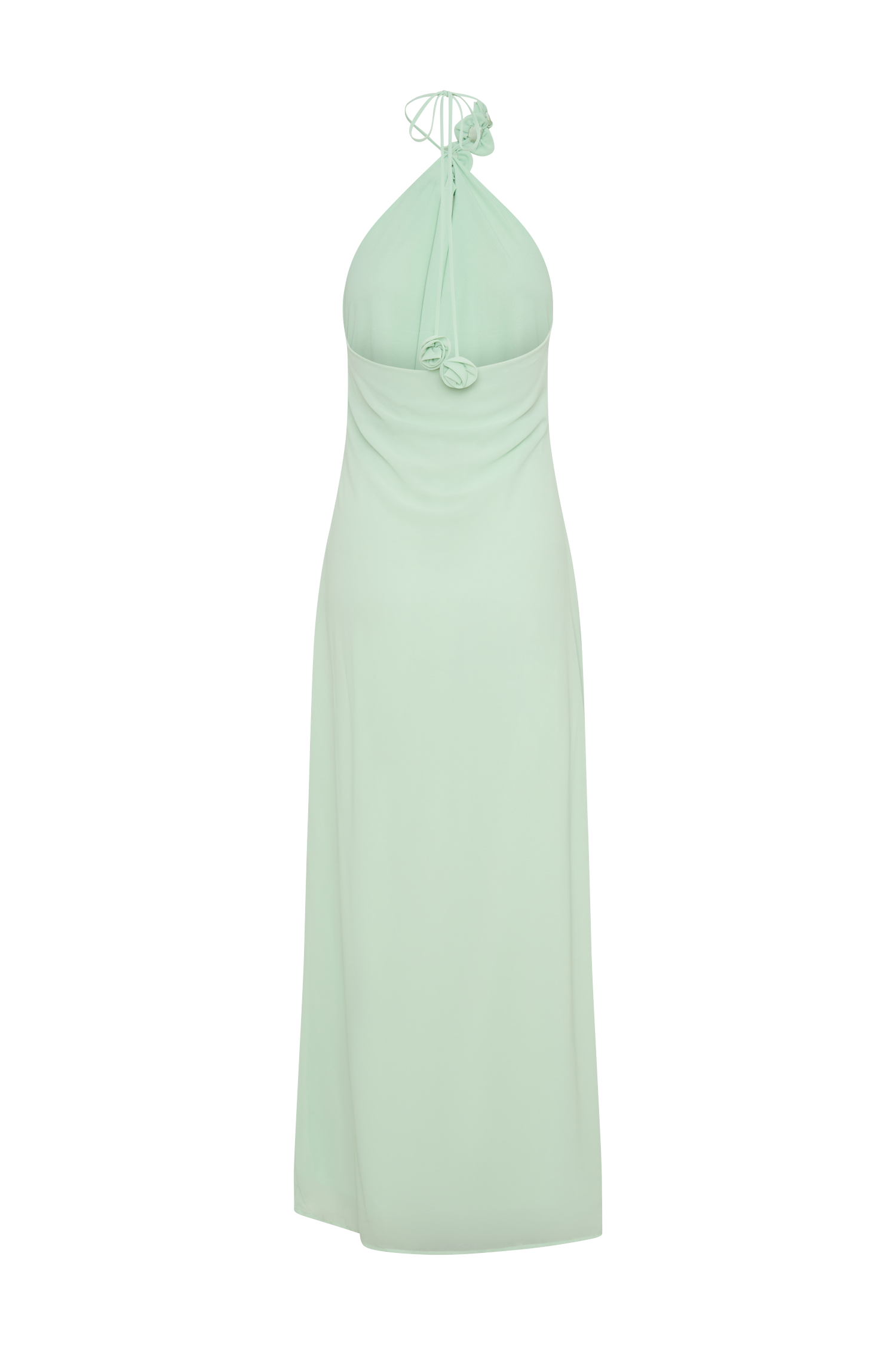 The ROSALIA Cowl Neck Maxi Dress is a captivating blend of elegance and romance. Featuring a deep cowl neckline and an alluring open back, this dress is designed to turn heads. Designed to have a soft draped fit around the neckline and soft fit body, the adjustable halter tie ensures a perfect fit, while the delicate chiffon rose applique detail adds a touch of whimsical charm. With its relaxed, drapey fit and floor-skimming maxi length, this dress is both effortlessly graceful and strikingly sophisticated.