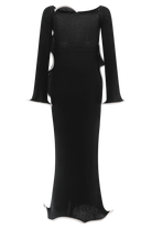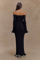 The SANDRINE Off Shoulder Knit Maxi Dress is a striking blend of romance and refinement. Designed with a Bardot neckline and long sleeves, this fitted silhouette features flared sleeve hems and delicate ripple panel detailing through the front. The fishtail hem and softly rippled finish create graceful movement, while the unlined knit fabrication hugs the body in all the right places. this dress is your go-to for elevated evenings, balancing softness with sculptural allure.
