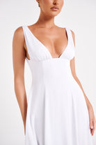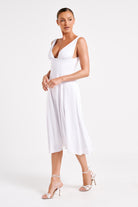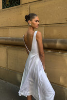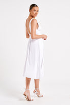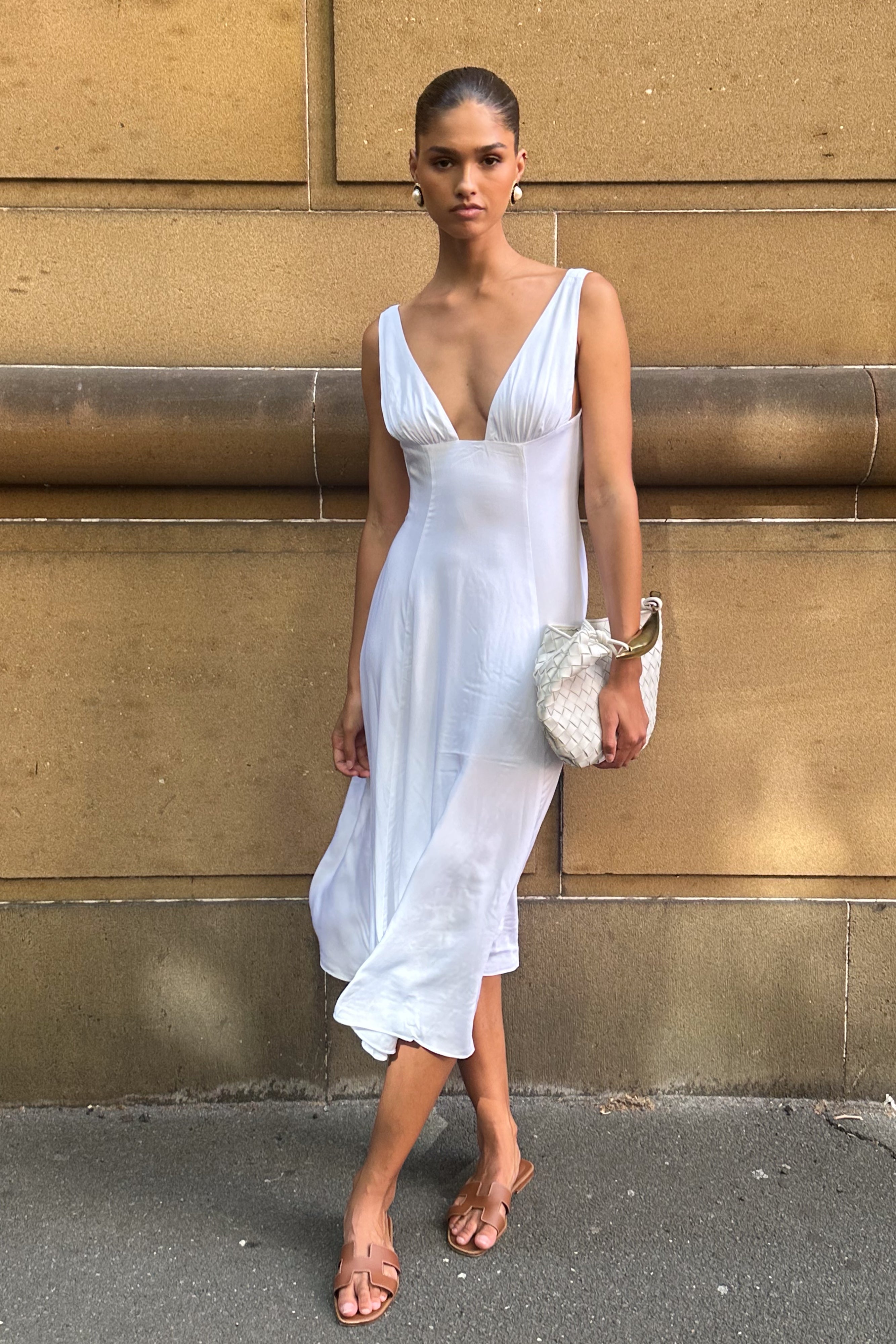 SOLEDAD is a sleeveless midi dress with a low, open back and plunging neckline. Wide shoulder straps and a cinched, structured waist are complemented by a flowy A-line skirt, creating a vivid, feminine silhouette. Subtle details like ruching beneath the chest and the soft pleats of the skirt enhance the dress’s timeless, classic design. An invisible zipper closure at the back ensures a quick, seamless fit. Graceful and delicate, this ensemble will look perfect with slender heels, like Brandy Ankle Strap Heels.