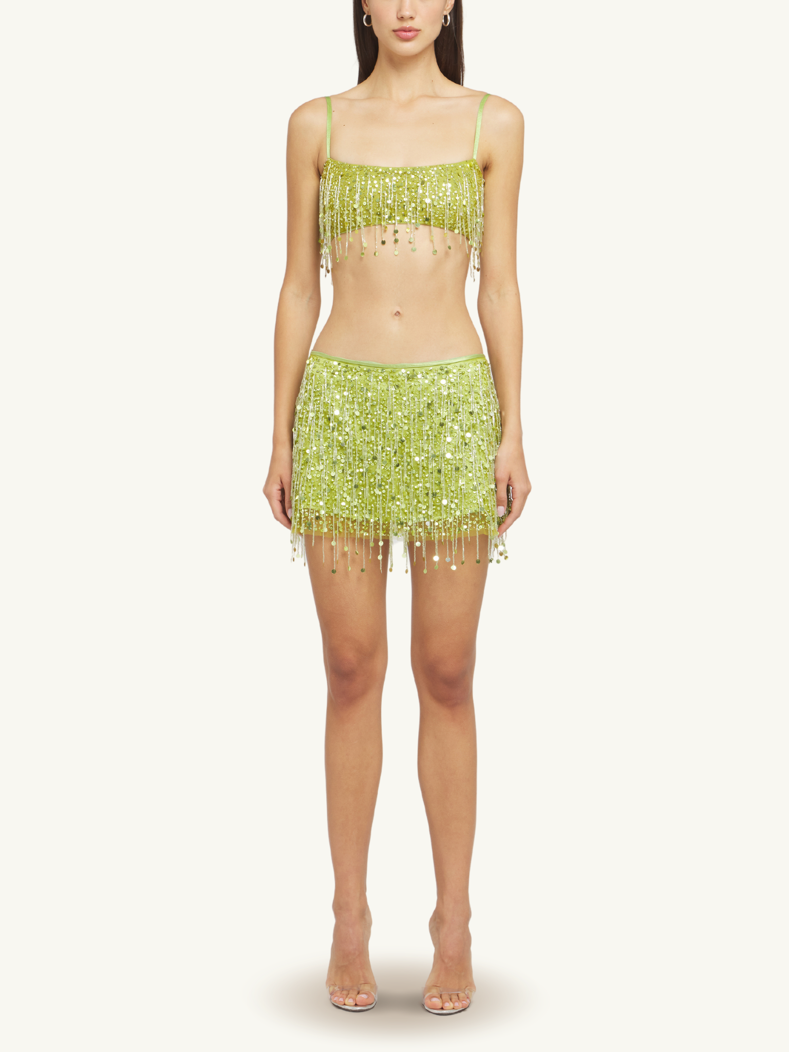 • Sequin and bead embellishments add radiant texture and high-impact shine