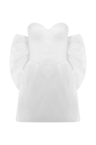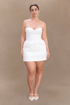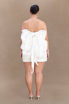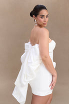 The SUZETTE Taffeta Bow Mini Dress is a statement of femininity and charm. Designed with a romantic princess neckline and sculpted bust cups, this dress flatters with internal boning for a structured, supportive fit. The shaped waistline enhances the silhouette, flowing into a voluminous full skirt for dramatic movement. An oversized removable back bow adds a touch of whimsy, allowing for versatile styling. Fully lined and finished with a back zip and hook-and-eye closure, the Suzette dress is perfect for bridal celebrations, soirées, or any occasion that calls for a bold yet graceful look.