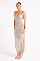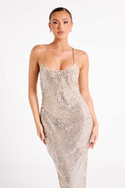 TIERRA is a glamorous maxi dress strategically embellished with silver sequin in beautiful figure-enhancing patterns. The halter neckline is graced with delicate thin straps over your otherwise bare shoulders that seamlessly provide maximum support for the dress. The bodycon fit and maxi length combines to create a gorgeous and sexy silhouette so you can leave any occasion with a lasting impression. Style it with the Kailani Platform Heels in a complementary silver colourway for optimum impact.