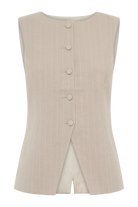 Elevate your ensemble with the sophisticated charm of the TRACEY Pinstripe Suiting Vest. Designed with meticulous detail, this sleeveless vest features a round neckline that exudes timeless elegance. The vest shape and princess panel lines offer a tailored silhouette that flatters your figure with grace. Complete with a centre front button closure and a back vent for added ease of movement, it seamlessly combines style and functionality.