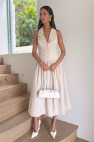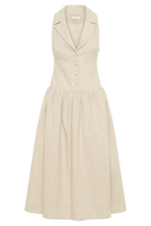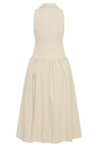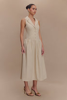 Effortlessly elegant and timelessly chic, the VALERY Linen Midi Collar Dress is a wardrobe must-have for refined style. Featuring a classic collared neckline and a functional centre-front button closure, this sleeveless dress blends sophistication with ease. The fitted bodice accentuates your silhouette, while the drop waist transitions into a full, gathered skirt for a flattering and graceful flow. Designed in a midi length and fully lined for comfort, this dress is perfect for brunches, garden parties, or warm-weather events.