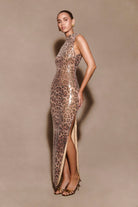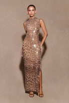 The VERONICA Sequin Midi Dress is designed to make a dazzling entrance with every step. Featuring a grown-on neckline and a sleek, sleeveless silhouette, this bodycon dress hugs your curves in all the right places. The bold leopard sequin pattern adds a glamorous twist, while the leg split and back vent offer ease of movement and a hint of allure. A centre-back zip completes the look for a flawless fit. Perfect for any evening affair, this dress ensures you’ll sparkle from every angle.