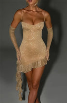 The Vyressa Shimmer Detachable Sleeves Ruffle Mini Dress combines playful ruffles with a dazzling shimmer, making it the perfect choice for festive occasions or glamorous nights out.