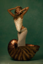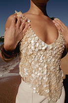 The WILLOW Mother Of Pearl Halter Top captures oceanic elegance with exquisite craftsmanship. Featuring a flattering V neckline and an alluring asymmetrical hemline, it embodies modern sophistication. The open back design, adorned with genuine mother of pearl shell on mesh, offers a luxurious feel and striking contrast. It includes a side zipper for easy wear. Please handle this carefully, as this item is heavy and crafted from authentic mother of pearl shell pieces. Perfect for special occasions or evening events, the Willow top seamlessly blends intricate detail with timeless allure, ensuring it stands out as a captivating piece in any wardrobe.